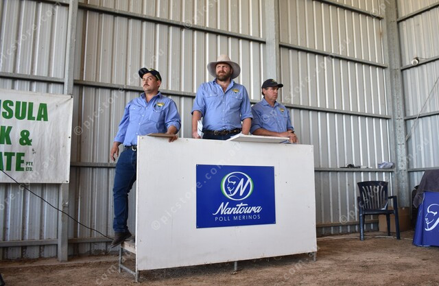 Eyre Peninsula Livestock and Real Estate’s Matt Brown, auctioneer Ben Dohnt and Kurt Baldwin. (Charlotte Martin: 428345_03)