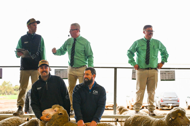 Braden Southern, Gordon Wood and Ben Dickenson atop the auctioneers planks, with Locky Crabb and Jared Searle showcasing the rams on display. (494852_10)