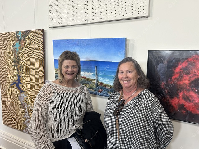 Sandy Harder and Emma Williams in front of Emma’s oceanscape entered into the Kimba Art Prize. (509894_04)