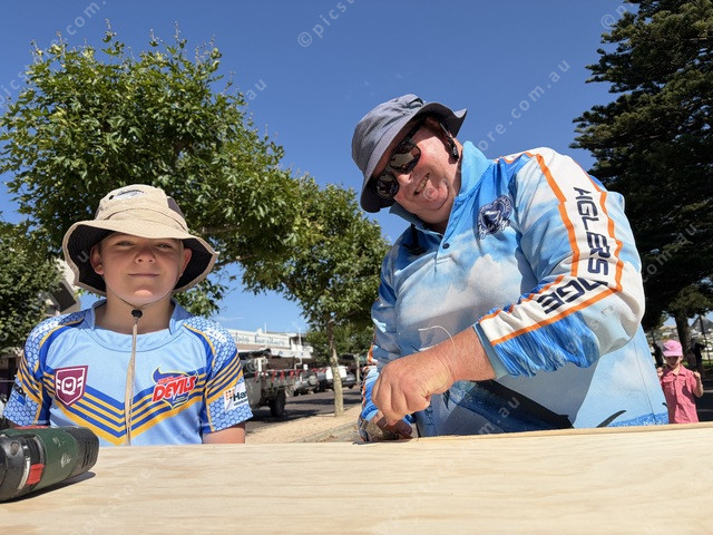 Toby and Gavin Walding building their boat Minion Express. (Charlotte Martin: 529480_15)