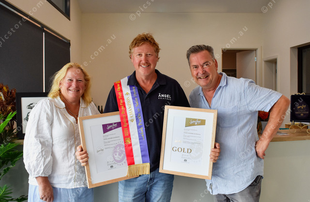 Finalist judge Kate Lorimer-Ward, Angel Oysters founder Zac Halman and judge Simon Marnie at the Port Lincoln office. (Charlotte Martin: 454909_02)