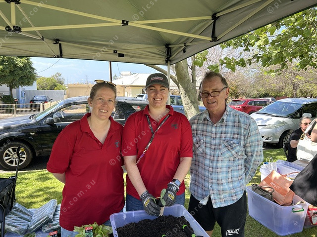 Emma Bridgen and Eboni Nayda from Bunnings gave Ben Jacko Paton his (prize winning) pumpkin seedling. (510951_04)
