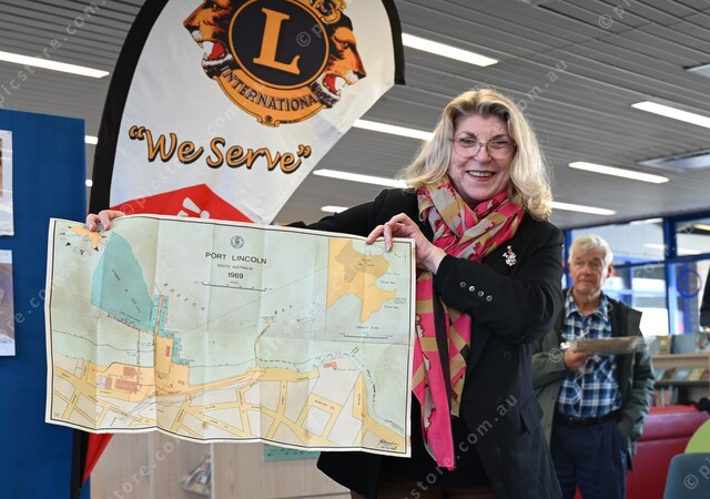 Port Lincoln mayor Diana Mislov with a map of the city from 1969, gifted from the mayor at the time of the capsule’s closure, Geoffrey Davey. (491165_04)