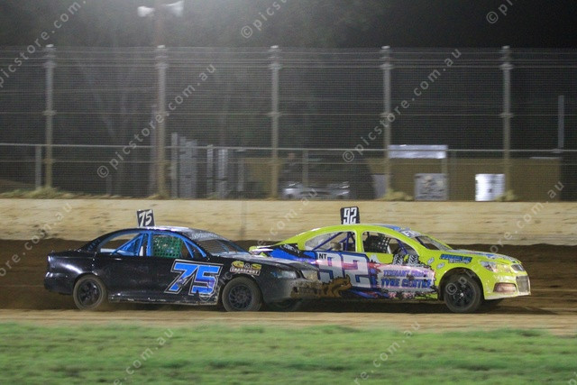 BATTLE: Lucas Fry holds Jack Thomson at bay during a Street Stock heat. (PIC: PHIL WILLIAMS)