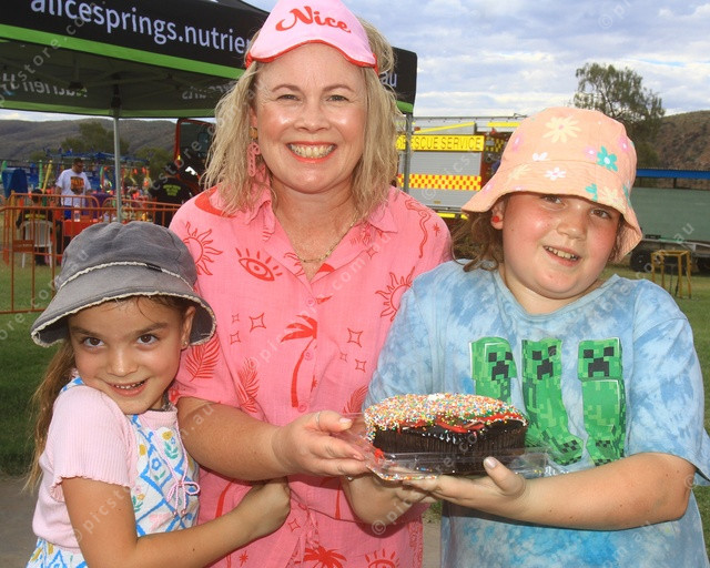 RESULT: Allison Bitar with her daughters Jemima and Zelda with the end result of her blindfolded cake decoration challenge. (PIC: PHIL: WILLIAMS 519465_07)