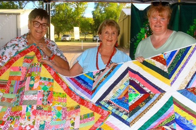 QUILTERS: Sue Martin, Vicki McDonald and Nichole Schrawayer show off some hand made quilts. (PIC: PHIL WILLIAMS 519465_19)