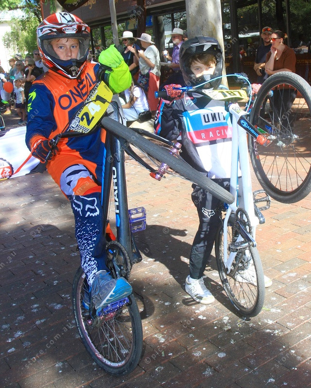 MONOS: Two riders from the BMX Club pull a mono during the parade. (PIC: PHIL WILLIAMS)
