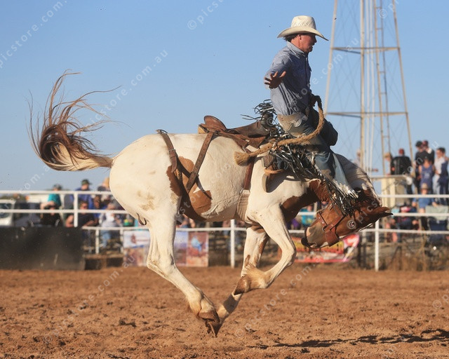 OVER: A rider about to be flung over his ride’s head during a saddle bronc ride. (PIC: PHIL WILLIAMS)