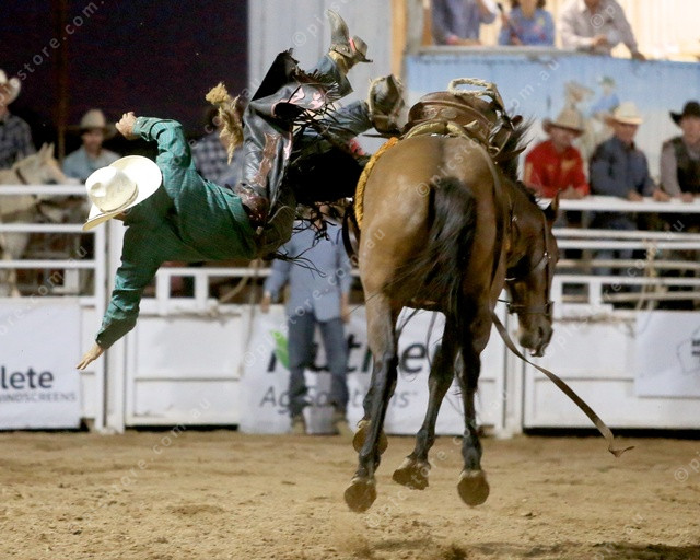 OFF: A saddle bronc rider has an early finish to his Carrieton ride. (PIC: PHIL WILLIAMS)