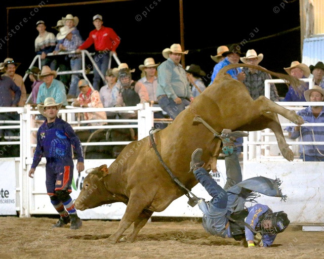 HEAVY: A coboy about to have a heavy landing after being tossed fron his bull. (PIC: PHIL WILLIAMS)