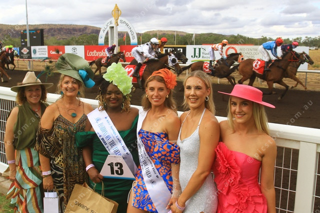FoF: Winners of the Fashions on the Field categories stand trackside as the horses fly past. (PIC: PHIL WILLIAMS 467246_36)