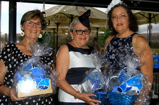 Tania Rimington, Sheila Hill and Bec Strickland with their Dolly’s Dream Raffle prizes at Ladies Day. (PIC: PHIL WILLIAMS 467246_37)