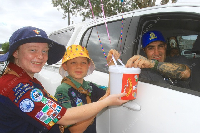 GENEROUS: Peter Nash makes a generous McHappy Day donation to scouts, Charlie Rumpf and Josh Goodman. (PIC: PHIL WILLIAMS 517818_06