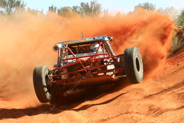BOUNCE: Shane Greening lifts the front whells as he bounces out of bulldust hole. (PIC: PHIL WILLIAMS)