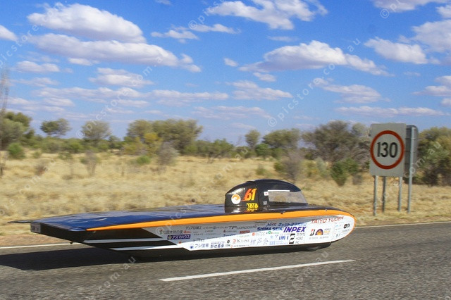 LIMIT: The Wakayama University team passes a 130kmh speed limit sign on the Stuart Highway. (PIC: PHIL WILLIAMS. 499721_29)