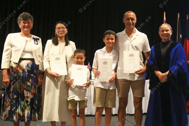 FAMILY: The Sayer family with Assistant Administartor, Fran Kilgarrif and Deputy Mayor, Alison Bitar after becoming new citizens on Australia Day. (PIC: PHIL WILLIAMS)