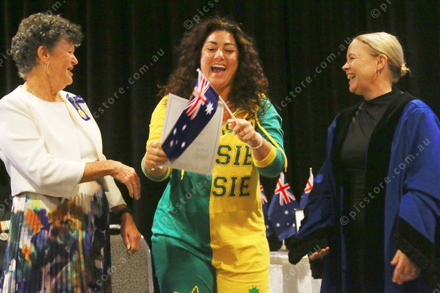 Fran Kilgariff and Alison Bitar share Viviana Desanto’s excitement at becoming a new Australian. (PIC: PHIL WILLIAMS)
