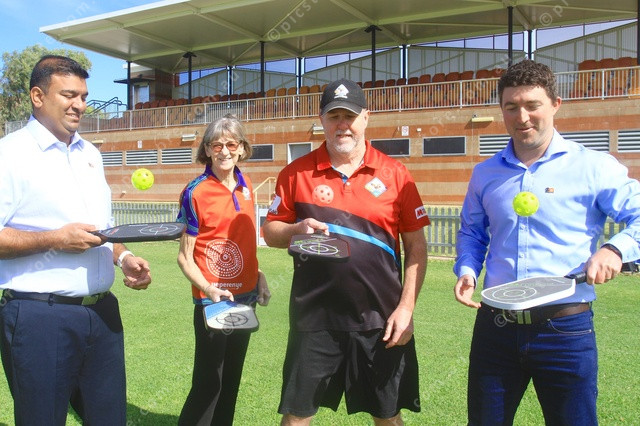 TEST: MInister Charls, Colette Johnston, Greg Clark and Josh Burgoyne practice their pickleball skills. (PIC: PHIL WILLIAMS 475804_04)