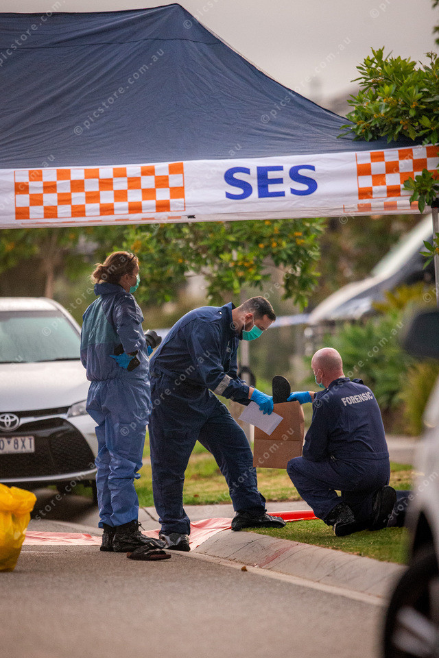 Forensic police at the crime scene on Observatory Street in Clyde North, picking up evidence and bagging it.
