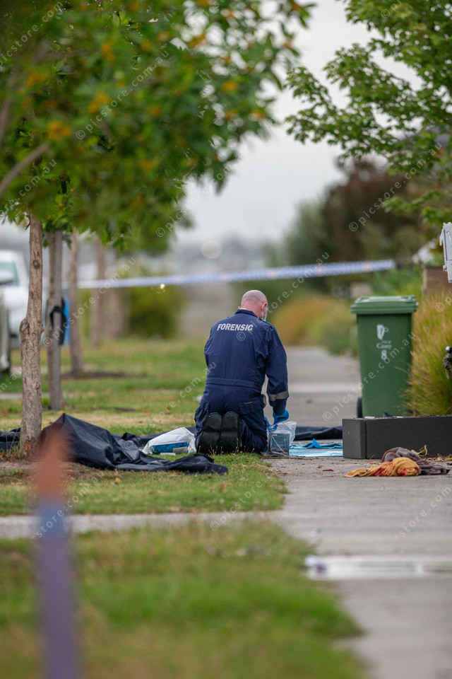 Forensic police at the crime scene on Observatory Street in Clyde North, picking up evidence and bagging it.