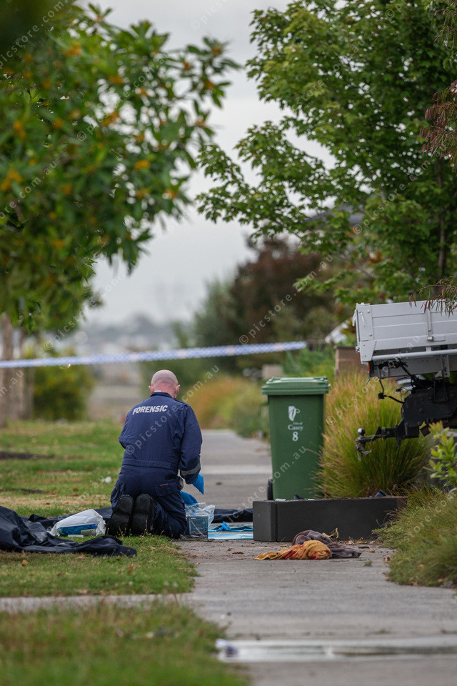 Forensic police at the crime scene on Observatory Street in Clyde North, picking up evidence and bagging it.