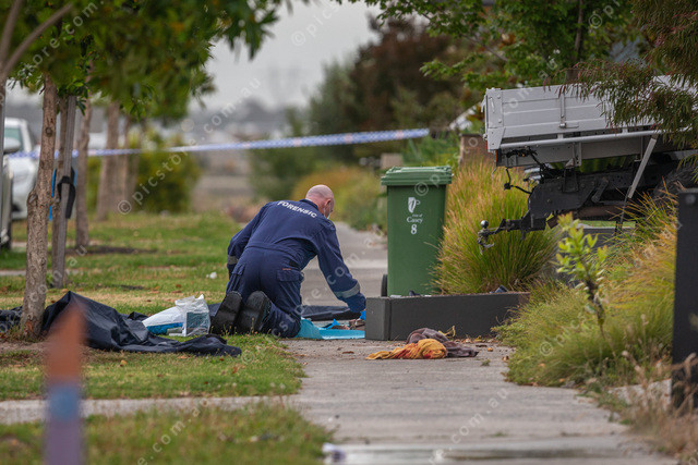 Forensic police at the crime scene on Observatory Street in Clyde North, picking up evidence and bagging it.