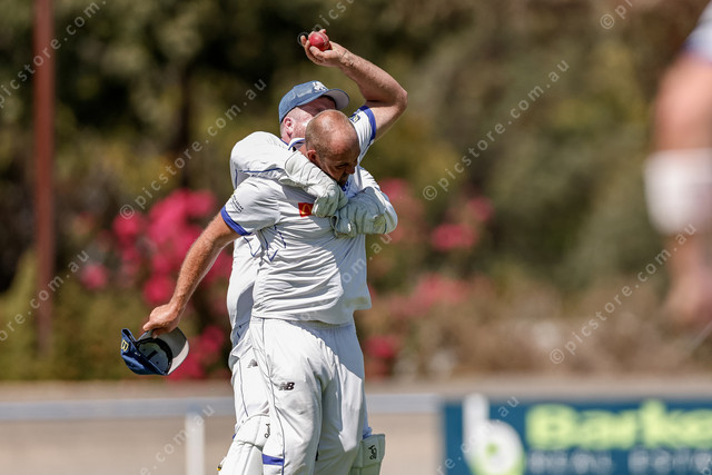 Danny Kaye (SG) holds the ball high after taking a catch to dismiss Troy Scott (M) off the bowling of Matthew Knight (SG)