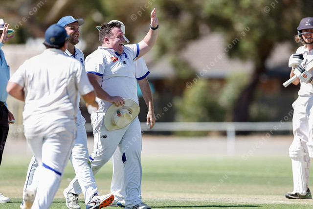 Matthew Knight (SG) celebrates his fifth wicket with his team-mates