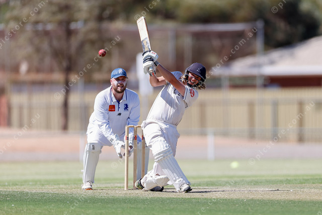 Cameron Curnow (M) lofts the ball over mid-wicket as wicket-keeper Vaughn Kroon (SG) watches on
