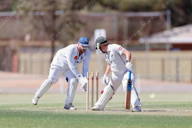 Wicket-keeper Vaughn Kroon (SG) keeps Angus Hudson (M) honest with an attempted stumping