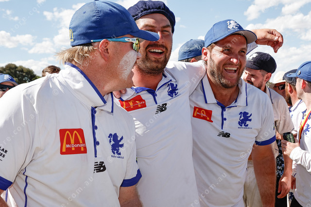 Jackson Harnas, Andrew Mapstone, Ben McMullen and Chris Graser of South Gawler celebrate their win against Mallala