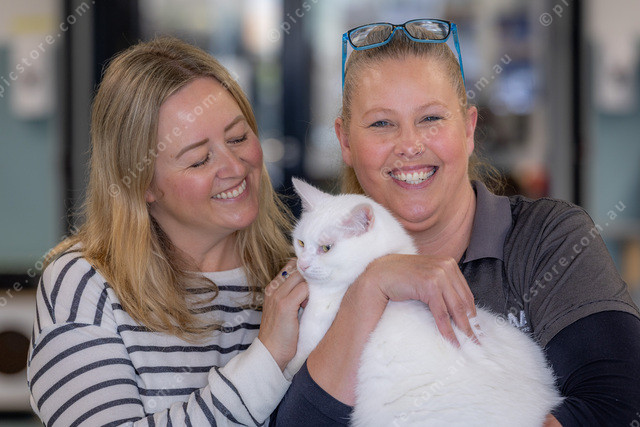 L-R Lisa Hauck and Mandy Warrick from AAPS with Blanca the Cat that is up for adoption.