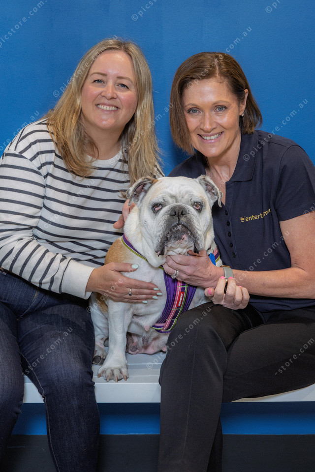 Georgia an English Bulldog that is up for adoption with L-R Lisa Hauck and Mandy Warrick.