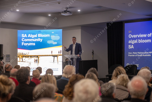 South Australian Premier Peter Malinauskas addresses the crowd at the algal bloom forum in Victor Harbor on Tuesday, August 12. (Dani Brown: 496057_01)