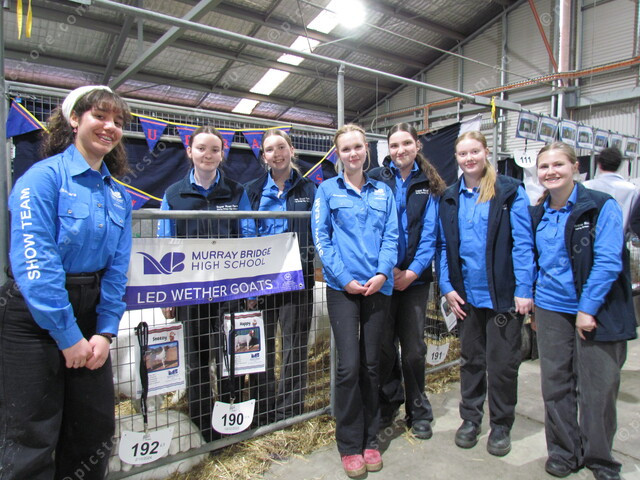 Murray Bridge High School students Samara, Felicity, Tamika, Charlotte, Olivia, Mackenzie and Rachel in the Goat Shed. (Sophie Conlon: 501384)
