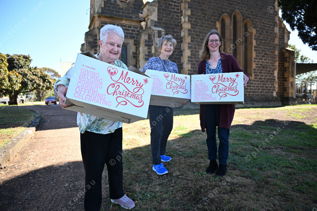 Bacchus Marsh Uniting Church will be a pick up and drop off point for the adverse advent calendar initiative. Pic of church members: Iris Blythe, Margaret Murphy and Kylie Lumb. (Damjan Janevski). 513789_03