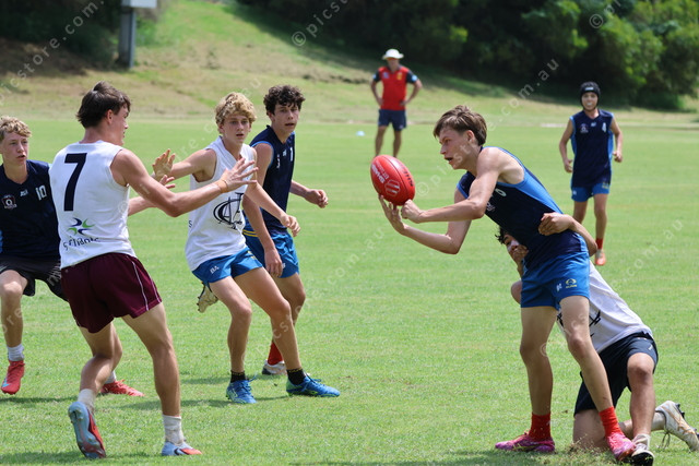 Tanna Sell looks to handball away while being tackle down by Thomas Stocker.