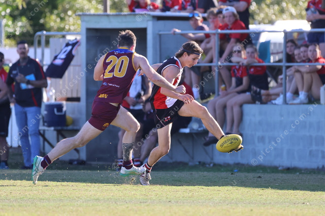 BITS’ Kye Croft puts it on the boot before Glenmore’s Brandon Ross gets to him.