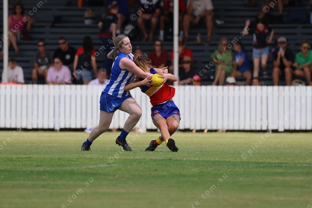 Brothers’ Erin Buchan collects Gladstone’s Caroline Ready in a tackle.