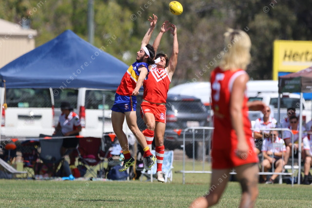 Gladstone’s Jake Cosgrove and Yeppoon’s Jack Bailey contest a mark.