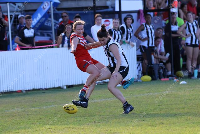 Rockhampton Panthers’ Elise Bottcher bumps Yeppoon Swans’ Mia Kitchener off the ball.