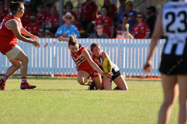 Panther Ashleigh Kincaid with a brilliant tackle on Swans’ Gabrielle Fitzgerald.