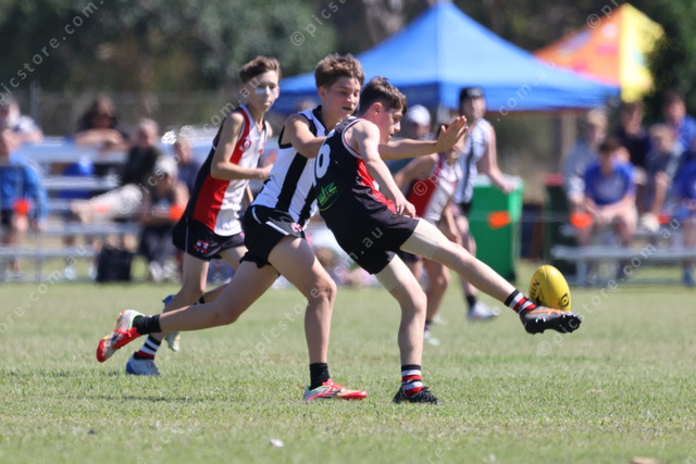 BITS’ Seth Sporne smashes the ball with Panthers’ Ethan Roati in pursuit.