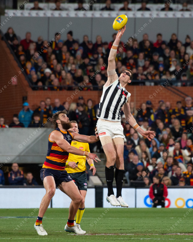 Collingwood ruck Mason Cox gets up high for the tap, leaving Adelaide’s Riley Thilthorpe in his wake, during the qualifying final. (Dani Brown: 506921_05)