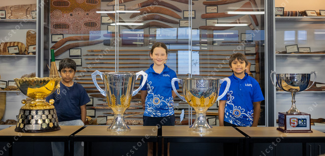 Lincoln Gardens Primary School students Joshua Betts, Karly Casserly, Angus Cook pictured with the AFL and SANFL premiership cups. (Mitchell Paterson: 467787_03)