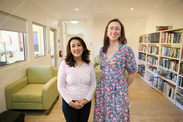 Sarah Littleton (volunteer) and Roshna Dongon (worker) standing infront of bare walls where are work can go_Ljubica Vrankovic_460409_05