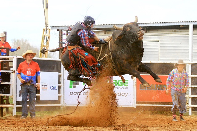 RAGING: Harrison Sutcliffe does his best to hang on before losing the battle against the raging bull. (PIC: PHIL WILLIAMS)