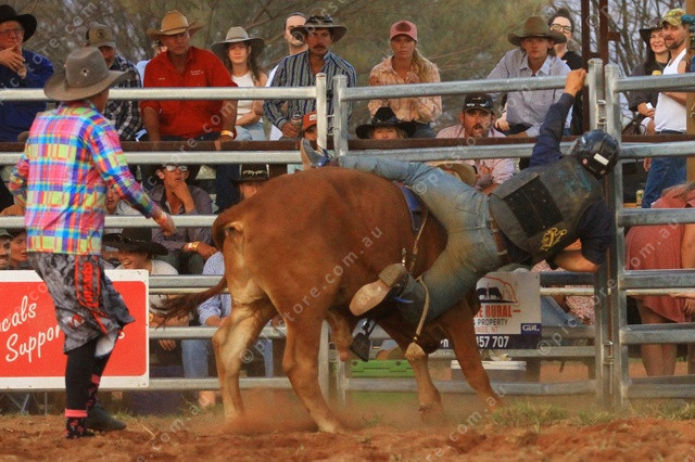 FENCE: A rider grabs the fence after losing the battle in the Open Bullock Ride. (PIC: PHIL WILLIAMS)