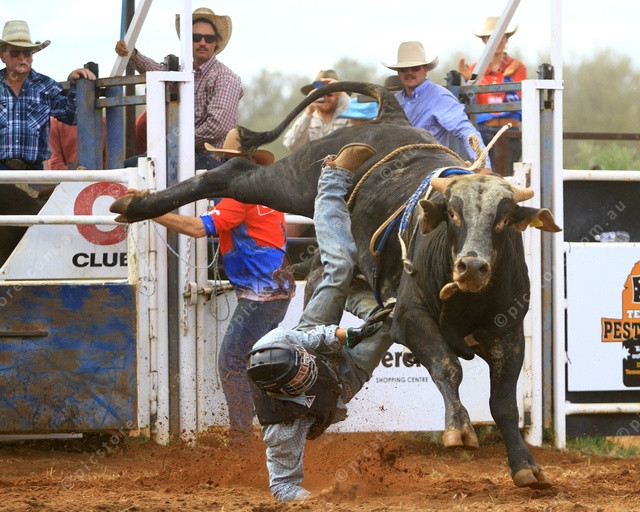 SHORT RIDE: A rider barely makes it into the arena before losing the battle with a bull. (PIC: PHIL WILLIAMS)