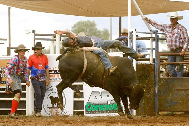 LAID BACK: A rider lays back during the battle with one of teh big bulls at Aileron. (PIC: PHIL WILLIAMS)